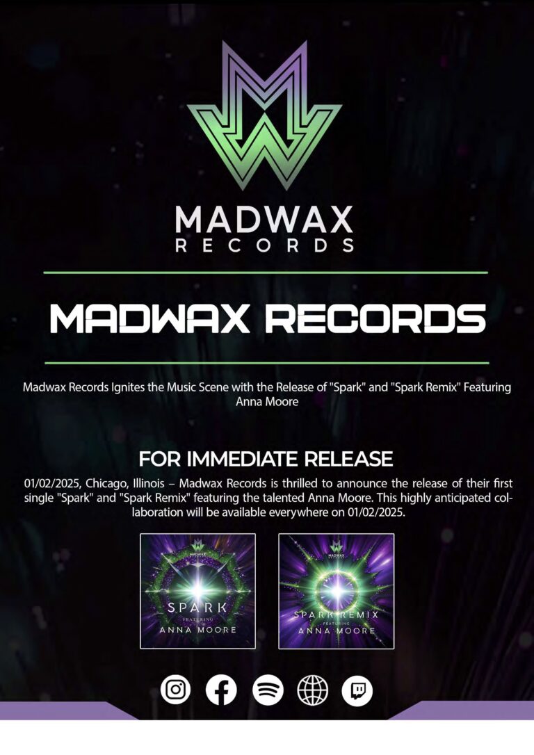 Madwax Records is thrilled to announce the release of their first single “Spark” and “Spark Remix” featuring the talented Anna Moore. This highly anticipated collaboration will be available everywhere on 01/02/2025.Dec 4,…
